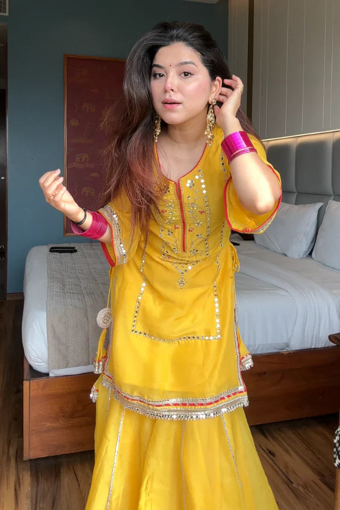 Designer Yellow Color Faux Blooming With Codding Zari Embroidered Sequins Work Beautiful Sharara Suit