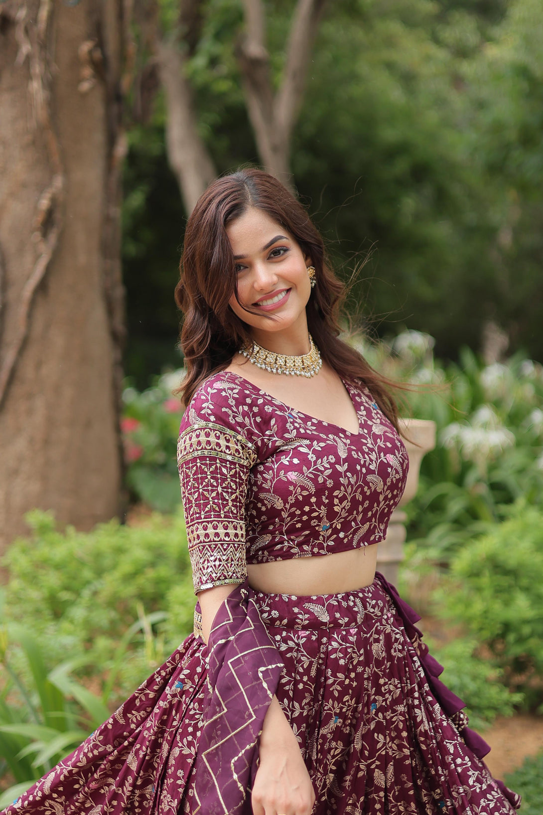 Beautiful Wine Color Pure Dyable Viscose Jacquard With Golden Embroidered Sequins Work Lehenga Choli
