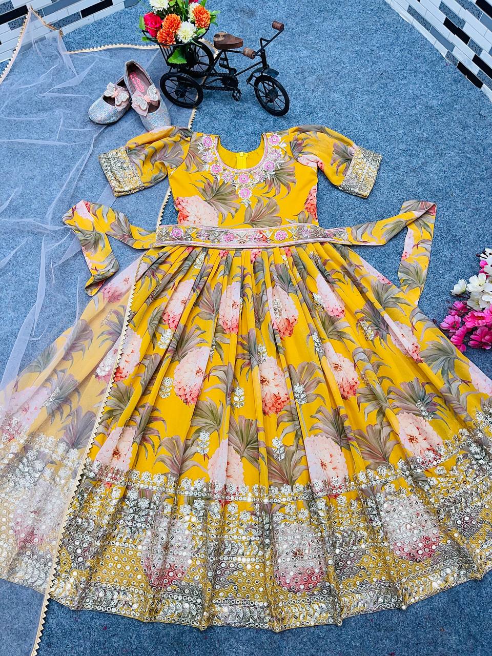 Designer Heavy Faux Georgette Yellow Color Digital Print Embroidered Sequin Work Gown With Dupatta And Kamar Belt