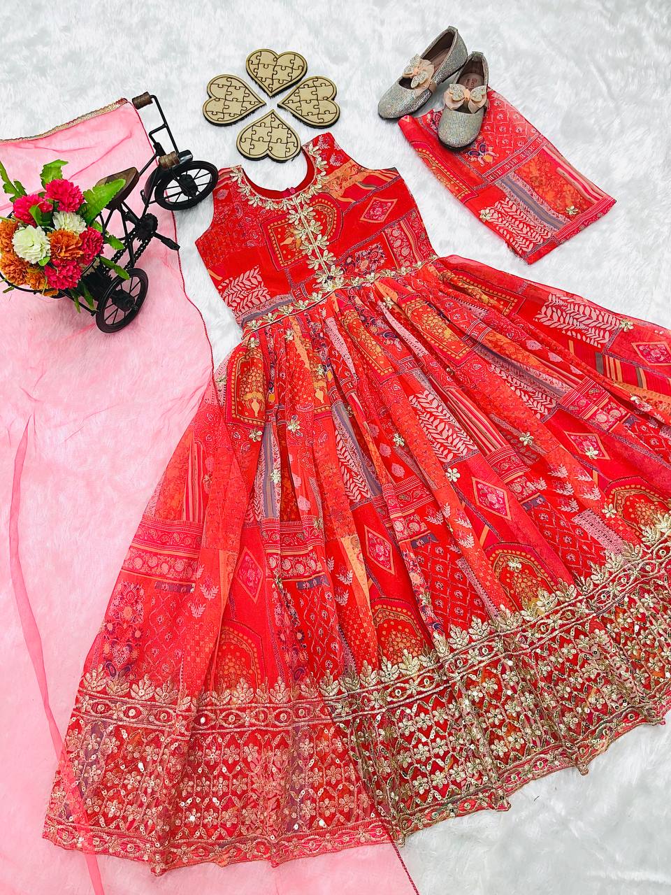 Let Your Little Diva Shine In This Exclusive Designer Alia-Cut Gown, Specially Crafted For Festive And Party Occasions. Made From Heavy Fox Georgette With Vibrant Digital Print And Intricate Sequin Embroidery, This Piece Delivers Style, Elegance, And Comfort In One Beautiful Outfit. The Look Is Completed With A Net Dupatta With Lace Border To Give It That Final Touch Of Grace.