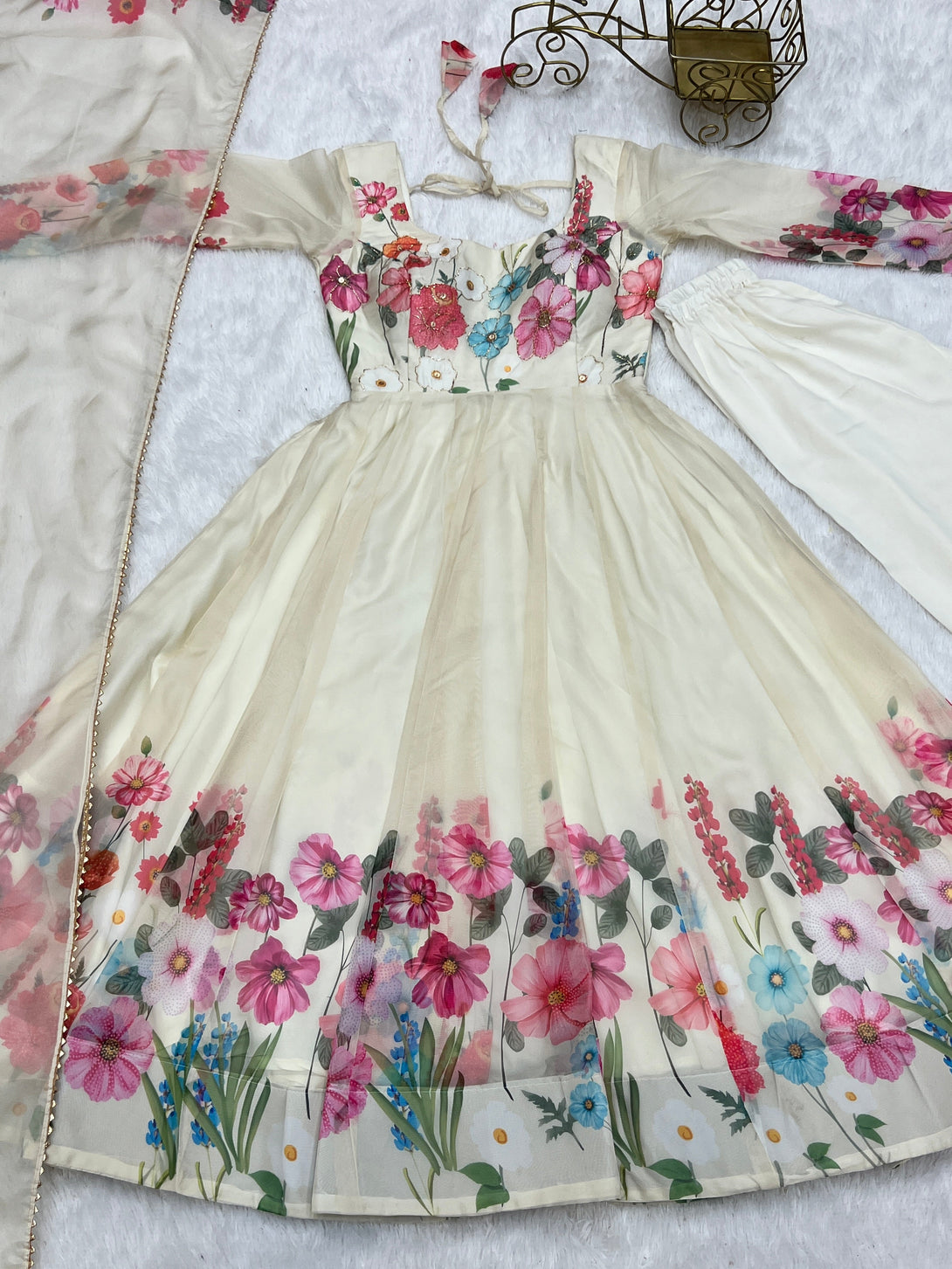 Festive Wear Multi Flower Print Cream Color Anarkali Suit