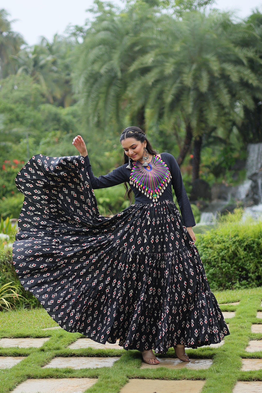 Festive Wear Printed Cotton With Kutchi Gamthi Work And 12 Meter Flair Black Color Navratri Gown