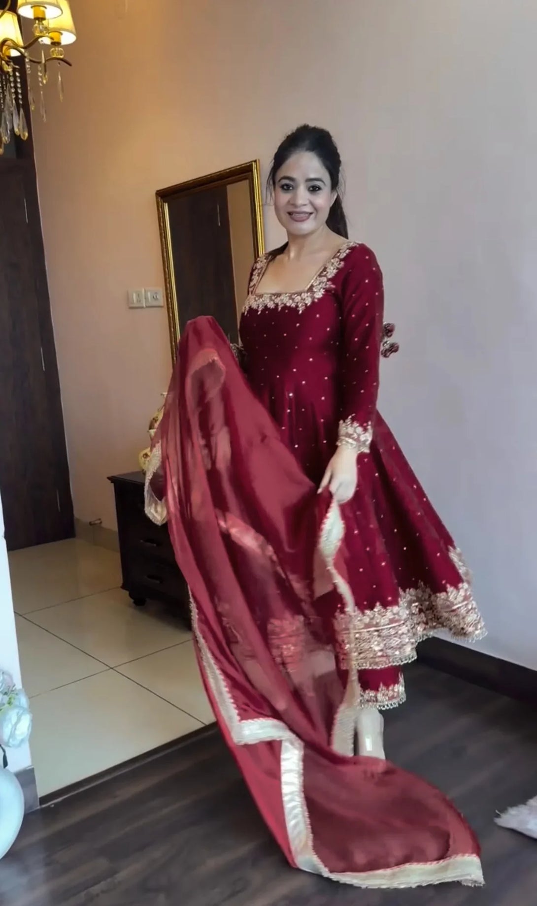 *Dupatta Fabric* :Heavy Pur Vichitra Silk With Rivet Moti Work With Four Side Fancy Readymed Lace Border