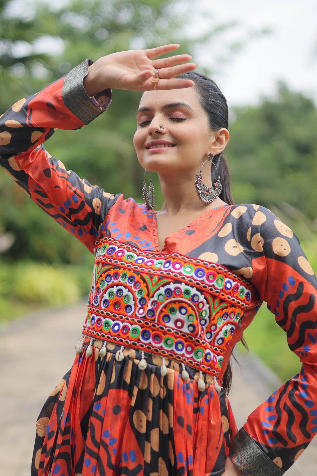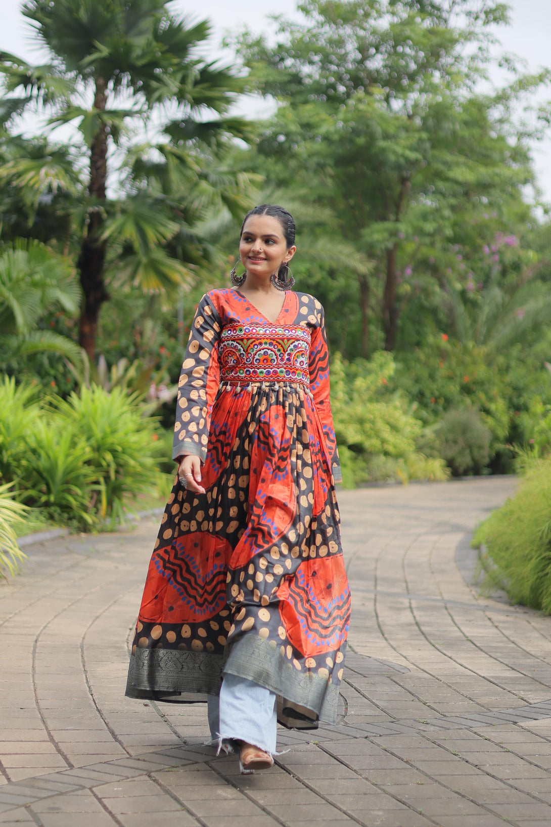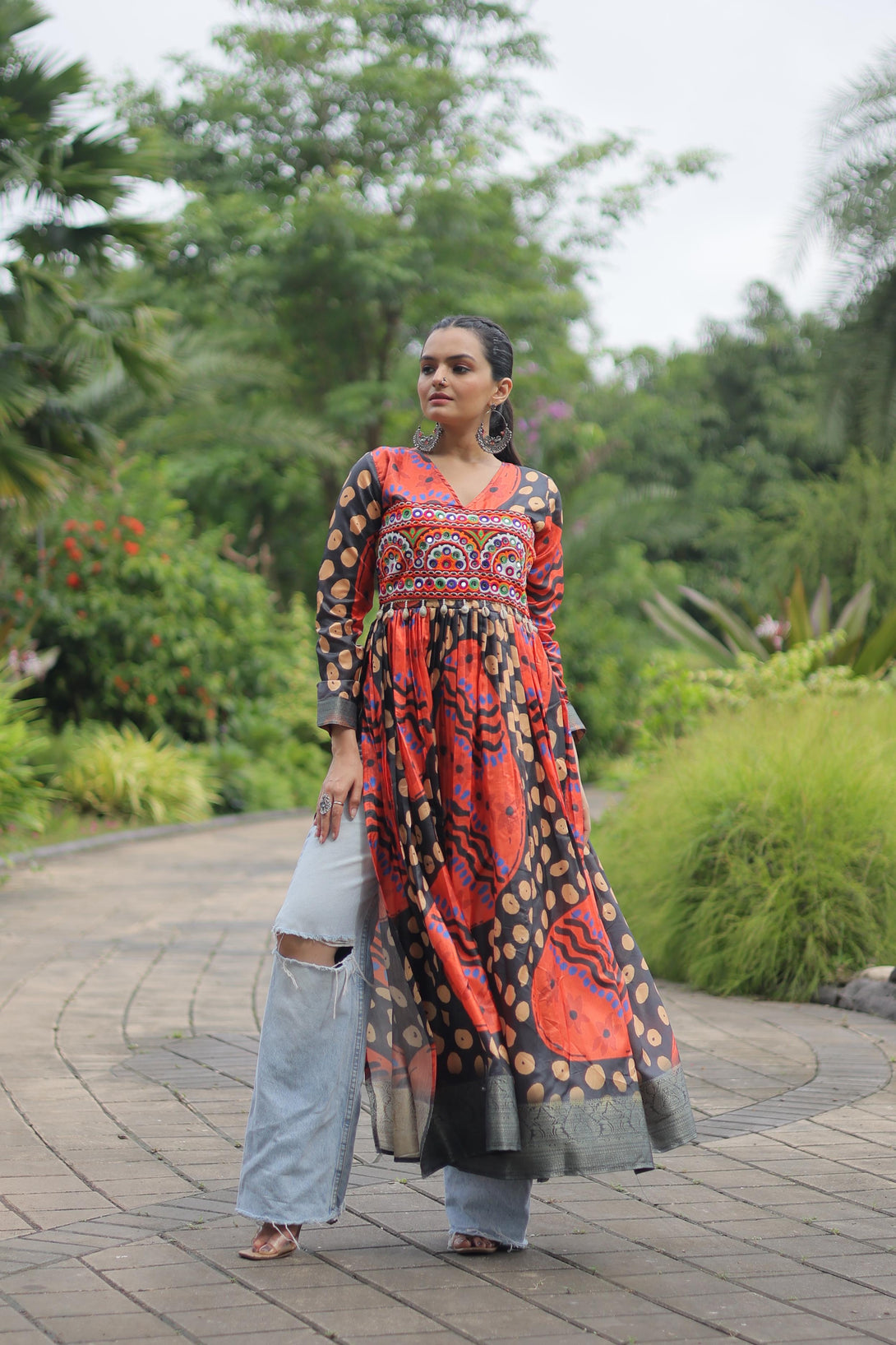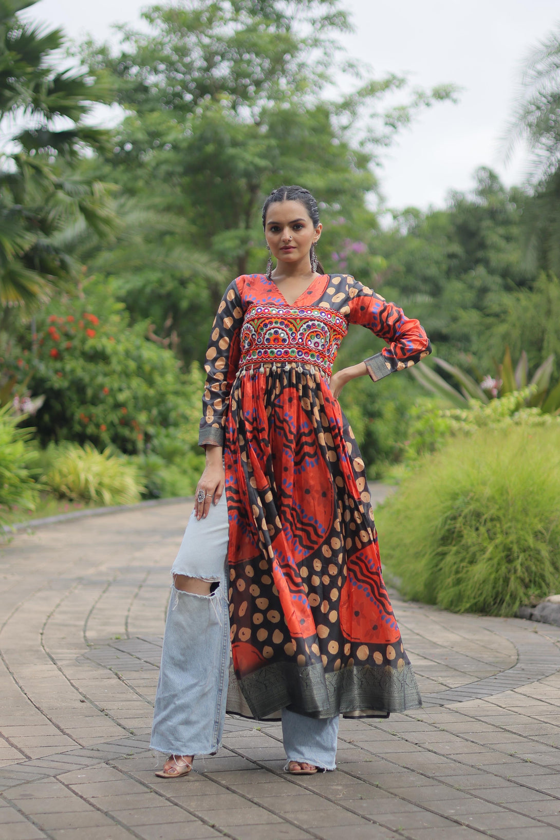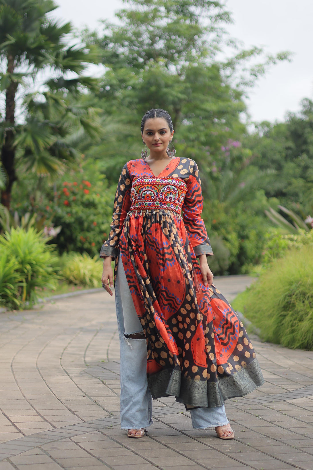 Printed With Kutchi Gamthi Work Red Color Navratri Kurti