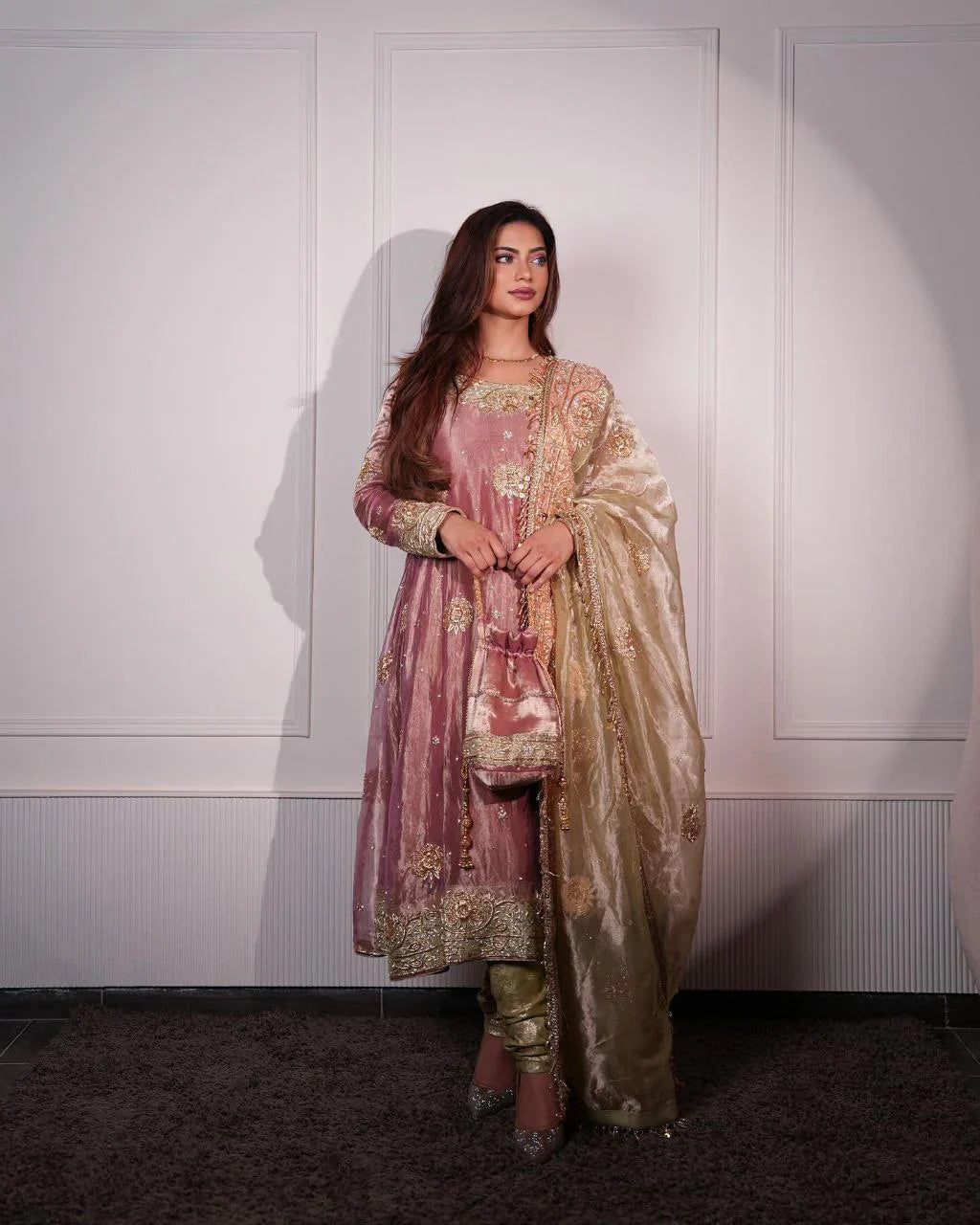 Wedding Wear Dusty Peach Colro Heavy Jimmy Chu Royal Elegant Anarkali Suit Set